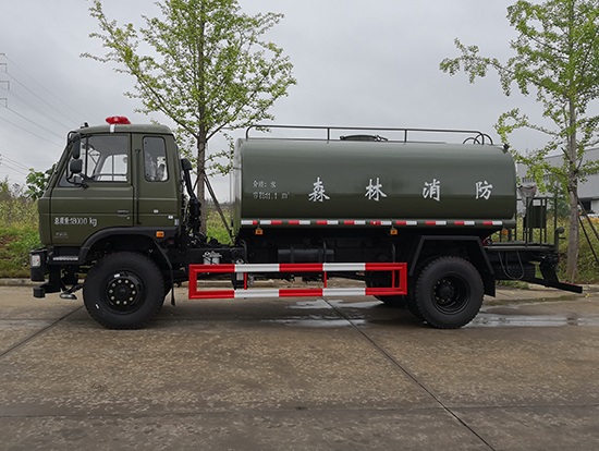 采用東風EQ2180GD5DJ型越野汽車底盤,東風一排半寬體駕駛室,4×4驅(qū)動,康明斯ISB190 50國五發(fā)動機,六檔變速箱,東風商用車橋,前驅(qū)動橋3.8噸,后橋10噸,10.00R20輪胎,軸距4500mm,電動玻璃,方向助力,斷氣剎,ABS。罐體采用優(yōu)質(zhì)碳鋼QB235板材,板材厚度4mm,罐體容積11.1立方,變速箱安裝取力器,大功率水泵可泵進泵出,后置工作平臺帶水炮射程25米,消防栓接口左右各一個,選裝駕駛室頂部安裝長條警燈帶喊話器,全車顏色軍綠,兩側(cè)噴涂白色森林消防字樣。