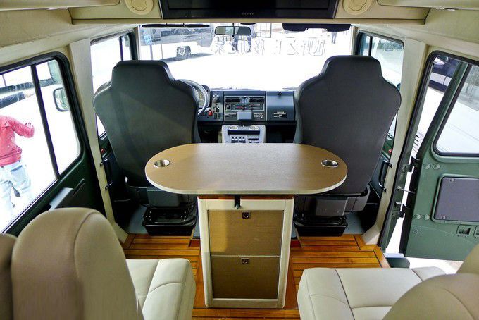 越野房車內飾:可以看到,柚木地板外加兩個電動座椅與一個帶儲藏柜的可移動多功能桌構成了這輛越野房車的第二排。除此之外,頭頂上方安置有26寸索尼液晶電視和帶衛(wèi)星電視機頂盒的藍光播放器,微波爐烤箱、小型冰箱、電磁爐等常用設備也是一應俱全,當然恒溫式的出水系統(tǒng)以及真空馬桶、獨立淋浴也是一樣不少。具備天窗和側窗的尾箱處安置有兩張舒適的標準床鋪,可以說盡管這輛U5000并非加長特裝版,但所有居住設備都很齊全。