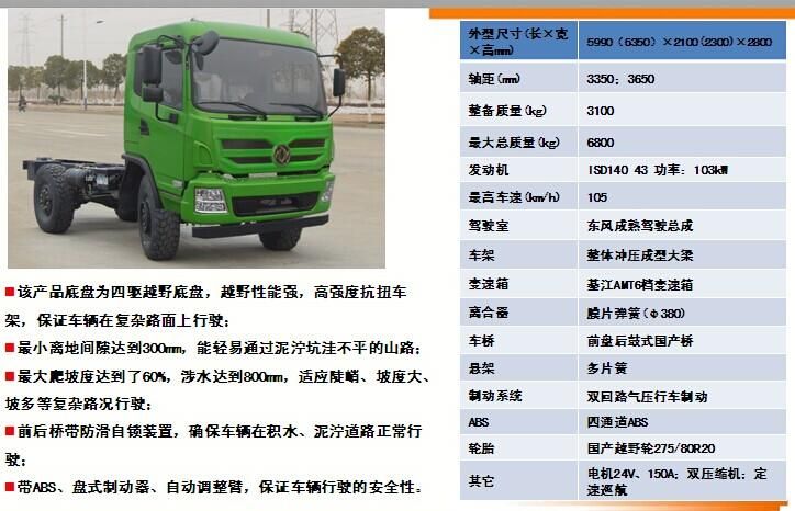 相關(guān)車型EQ2070GZ4DJ越野四驅(qū)底盤的詳細描述:該產(chǎn)品底盤為四驅(qū)越野底盤,越野性能強,高強度抗扭車架,保證車輛在復雜路面上行駛時,不會出現(xiàn)大梁斷裂等情況;最小離地間隙達到300mm,能輕易通過泥濘坑洼不平的山路;最大爬坡度達到了60%,適應陡峭、坡度大、坡多等復雜路況行駛。前后橋帶防滑自鎖裝置,確保車輛在積水、泥濘道路正常行駛;帶ABS、盤式制動器、自動調(diào)整臂,保證車輛行駛的安全性。