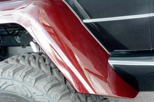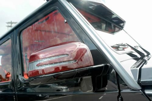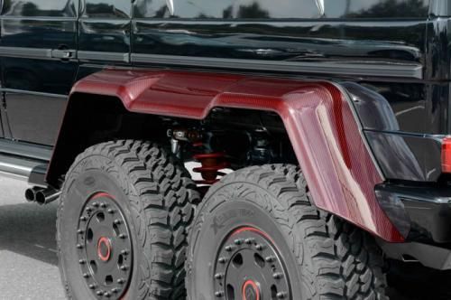 第一眼看去,這輛G63 AMG 6x6的涂裝會(huì)讓人感覺有些怪異。的確,這輛Brabus出品的六輪怪獸換上了紅色碳纖維車身改裝件,后視鏡蓋、輪眉以及引擎蓋都采用了紅色碳纖維材料。透過(guò)車窗我們能看到內(nèi)飾同樣是紅色主題,甚至是輪圈內(nèi)也有紅色點(diǎn)綴。
